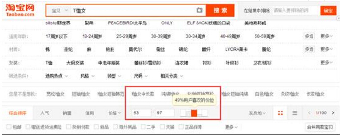 当然不可能是这样的!包括你在布局产品的时候,裙子的价格和T恤的价格肯定相差是比较大的,那怎么去判断他们是不是属于同一个价格区间呢(也就是说,价格标签是一致的)。其实很简单,搜索关键词,看你的价格柱就可以了。比如你夏天的时候卖女士T恤,那你就搜索“T恤女”: